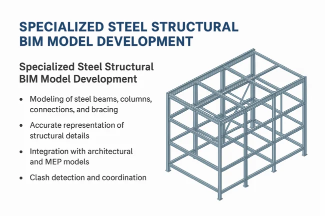 Our Specialized Steel Structural BIM Model Development service provides highly detailed, precise, and coordinated BIM models for steel structures. These models support design validation, fabrication, erection planning, and seamless collaboration across disciplines.